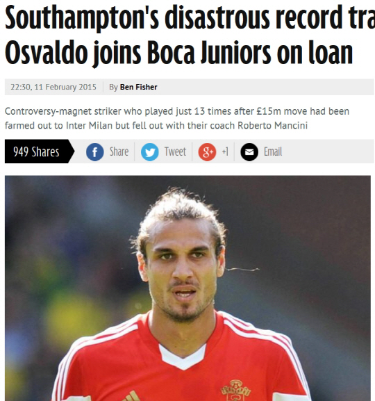 사우스햄턴은 13일(한국시각) 오스발도가 올해 6월까지 보카 주니어스로 단기 임대를 떠난다고 발표했다. 오스발도의 12번째 클럽이다. 오스발도는 실력 만큼은 확실하지만 성격 탓에 경기 외적인 문제를 일으켰다. 이탈리아 세리에A에서 맹활약을 펼친 오스발도는 2013년 구단 역사상 최고액에 사우스햄턴 유니폼을 입었다. 하지만 기대와 달리 13경기에 나서 3골 밖에 넣지 못했다. 설상가상으로 동료 주제 폰테와 주먹다짐을 하며 사실상 전력 외로 분류됐다.