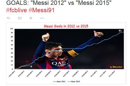 2015년 현재 기준으로 보면 3년 전 페이스보다 빠른 편이다. 메시는 2012년 당시 3월 1일 현재 9골을 기록했는데 올해는 이미 11골을 넣었다.