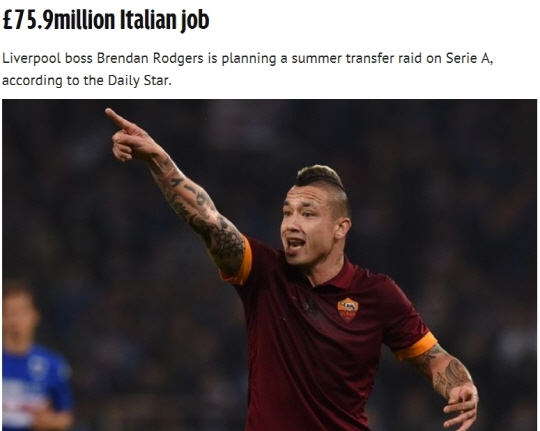 16일(한국시각) 영국 일간지 데일리스타는 리버풀이 AS로마의 미드필더 미랄렘 피야니치, 라디야 나잉골란 듀오와 라치오의 공격수 케이타 볼데 디아오를 노리고 있다고 보도했다. AS로마와 라치오는 모두 로마를 연고로 하는 구단들이다. 피야니치는 브렌단 로저스 감독의 눈길을 받고 있다. 로저스 감독은 피야니치를 스티븐 제라드의 대체자가 될 수 있을 것이라 평하고 있다. 피야니치의 몸값은 2500만파운드로 추정된다.