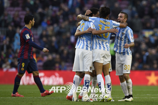 | 바르셀로나 선수들이 말라가의 골을 보며 낙담하고 있다. ⓒAFPBBNews = News1 |