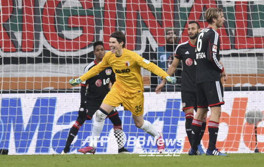 마윈 히츠 아우크스부르크 골키퍼가 골을 넣었다. 레버쿠젠 수비수들이 고개를 떨구고 있다.ⓒAFPBBNews = News1