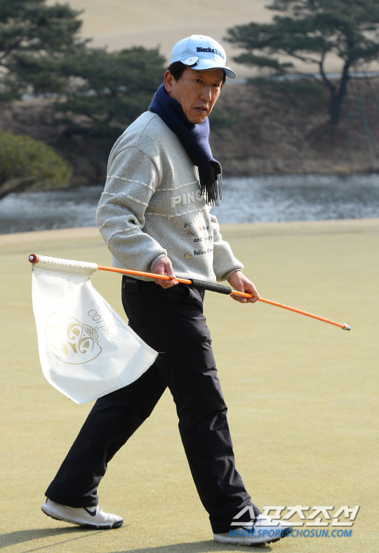 최강희 감독이 축구인 골프대회에서 퍼팅 후 그린을 직접 정리하고 있다. <용인=사진공동취재단> 송정헌 기자 songs@sportschosun.com/2015.02.26