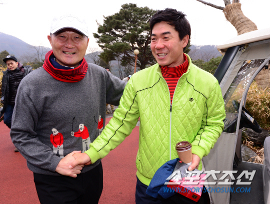 대한축구협회가 주최하고, 스포츠조선·스포츠경향·스포츠서울·스포츠월드·스포츠동아·일간스포츠 등 스포츠전문미디어 6개사가 공동으로 주관하는 '축구인자선골프대회'가 26일 경기도 용인 골드컨트리클럽에서 개최됐다. 김호곤 부회장(왼쪽)과 윤정환 감독이 반갑게 인사를 나누고 있다. <용인=사진공동취재단> 송정헌 기자 songs@sportschosun.com/2015.02.26