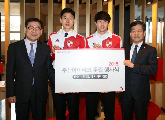 부산의 주장 이경렬과 공격수 박용지는 최근 서울 용산 아이파크몰에 위치한 현대산업개발 본사를 방문해 '우 결-우리끼리 결연'이라는 축구단-모기업 간 결연 프로그램에 참여했다.