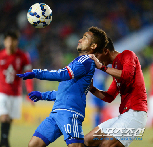 수원 삼성이 25일 오후 수원 월드컵경기장에서 우라와 레즈와 2015 AFC 챔피언스리그 G조 조별예선 1차전 경기를 치렀다. 수원 산토스가 우라와레즈 선수를 등지며 공을 차지하고 있다. 수원=정재근 기자 cjg@sportschosun.com/2015.02.25/