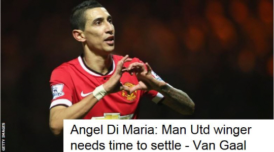 그러나 루이스 판 할 맨유 감독은 '적응 과정'이라며 디 마리아를 지지하고 나섰다. 판 할 감독은 영국 BBC와의 인터뷰에서 "새롭게 영입한 선수들이 첫 번째 시즌에는 항상 어려움을 겪는다. 많은 변수들을 살펴야 한다. 단지 경기 뿐만 아니라 문화도 생각해야 한다"고 밝혔다.