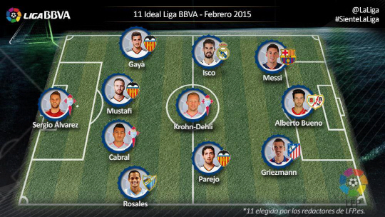 리오넬 메시(바르셀로나)와 이스코(레알 마드리드), 앙투안 그리에츠만(아틀레티코 마드리드) 등이 포함된 프리메라리가 2월 베스트 11이 발표됐다. 반면 크리스티아누 호날두(레알 마드리드)는 제외됐다.