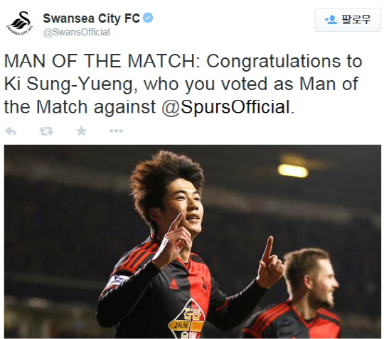 스완지시티 구단은 공식 트위터를 통해 5일(한국시각) 토트넘전이 끝난 뒤 기성용이 팬들이 뽑은 MOM에 올랐음을 알리고 축하를 보냈다.