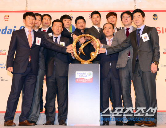 5일 서울 홍은동 그랜드힐튼호텔에서 K리그 클래식 2015 개막 미디어데이가 열렸다. 각 구단 감독과 팀을 대표하는 선수들이 참가해 올 시즌을 앞둔 출사표와 각오를 밝혔다. K리그 클래식은 오는 7일 전북과 성남의 공식 개막전과 함께 시즌을 시작한다. 현대오일뱅크 타이틀 조인식이 열렸다. 미디어데이에 참석한 각 구단 감독들이 우승트로피와 함께 기념 포즈를 취하고 있다. 홍은동=송정헌 기자 songs@sportschosun.com/2015.03.05 |