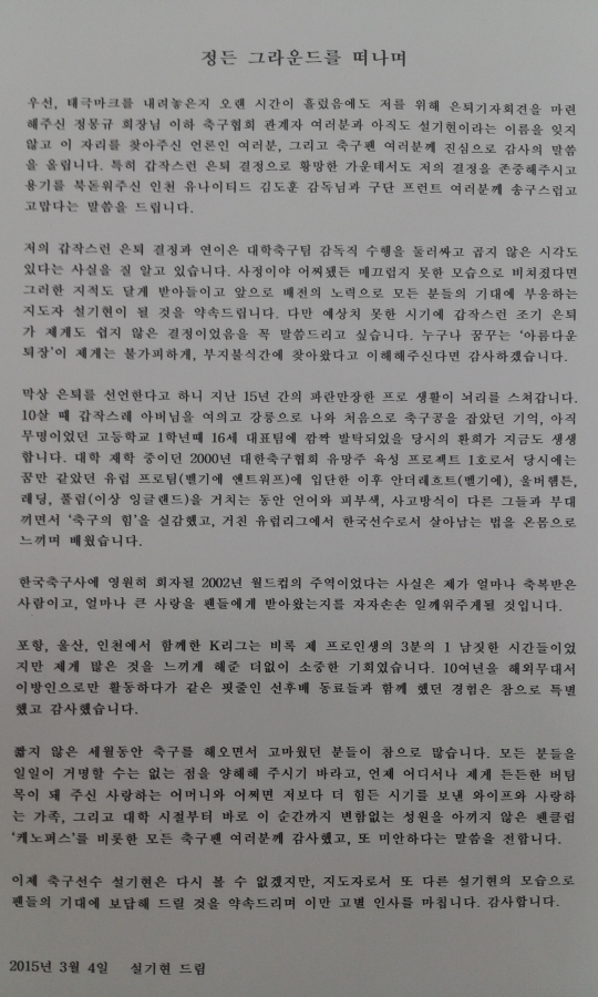 이에 대해 설기현이 속사정을 내비쳤다. 4일 서울 신문로 축구회관에서 열린 은퇴 기자회견에서다.