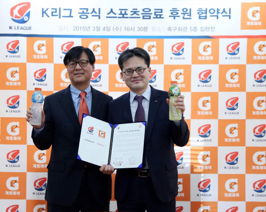 프로축구연맹은 4일 서울 신문로 축구회관 연맹 회의실에서 롯데칠성음료와 2016년까지 2년에 걸친 K리그 공식 음료 후원 협약을 맺었다. 이번 협약으로 롯데칠성음료는 2016시즌 종료까지 2년간 K리그의 공식 후원사로 활동하며, 롯데칠성음료는 K리그의 공식 음료로 독점적인 지위와 광고 마케팅 권리를 갖게 됐다.