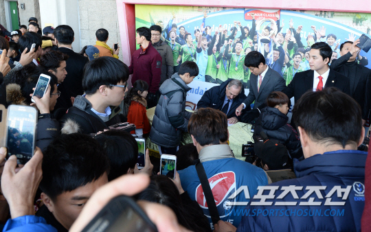 슈틸리케 축구대표팀 감독이 전주 축구팬들과 만났다. 7일 전주월드컵경기장에서 슈틸리케 감독이 2015K리그 클래식 전북-성남의 개막전에 앞서 팬사인회를 열었다. 슈틸리케 감독이 어린이팬에게 사인을 해주고 있다. 슈틸리케 감독은 개막전에서 시축으로 K리그 개막을 축하할 예정이다. 전주=정재근 기자 cjg@sportschosun.com
