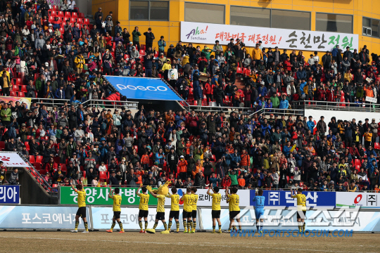'전남 레전드' '캐논슈터' 노상래 감독의 사령탑 데뷔전이었다. 무려 1만2608명의 관중이 몰렸다. 지난해 개막전 1만22명 기록을 훌쩍 넘어섰다. 광양의 총인구는 15만 명 남짓이다. 전체 인구의 15분의 1이, 일요일 오후 2시 축구장에 모여들었다. 스테보가 볼을 잡을 때마다 "스테보!"를 연호하며 열렬히 환호했다. '파도타기'응원으로 기분을 한껏 냈다. 전반 33분 배기종의 크로스를 이어받은 제주 공격수 김 현의 슈팅을 '45세 백전노장'이 두손으로 막아냈다. '절친' 노상래 감독의 데뷔전, '동갑내기 수호신' 김병지의 슈퍼세이브에 만원관중은 한목소리로 "김병지!"를 외쳤다.