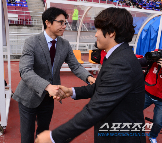 수원 삼성과 포항 스틸러스가 8일 수원월드컵경기장에서 2015 K리그 개막 라운드를 펼쳤다. 지난 시즌 2위를 차지했던 수원과 2년 만에 K리그 우승에 도전하는 포항의 맞대결이다. 경기 전 포항 황선홍 감독과 수원 서정원 감독이 인사를 나누고 있다. 수원=송정헌 기자 songs@sportschosun.com/2015.03.08