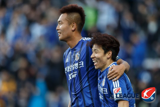 ◇김신욱(왼쪽)과 김태환이 8일 울산월드컵경기장에서 펼쳐진 FC서울과의 2015년 현대오일뱅크 K리그 클래식 개막전서 2대0 승리로 경기를 마친 뒤 환하게 웃고 있다. 사진제공=한국프로축구연맹