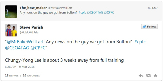 9일(이하 한국시각) 크리스탈 팰리스의 한 팬은 SNS를 통해 '볼턴에서 이적한 선수(이청용)에 대한 소식은 없나'라고 구단에 질문했다. 그러자 답변이 돌아왔다. 그것도 구단주가 직접 답변을 했다. '이청용은 정상 훈련을 소화한지 약 3주 됐다'고 전했다.