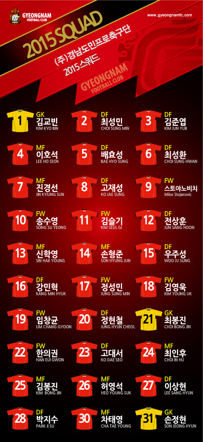 경남은 기존 선수 15명에 임대복귀 선수 2명, 새로운 선수 12명으로 총 30명의 선수단을 꾸렸다. 에이스의 상징 10번은 송수영이 달았다. 송수영은 지난 시즌 5골-3도움을 기록했다. 16번에서 10번으로 격상됐다. 지난 시즌 8골을 넣은 스토야노비치는 9번을 달고 그라운드를 누빈다. 주장 진경선은 7번을 선택했다. 우주성은 15번, 한의권은 22번을 단다. 임창균은 8번에서 19번으로 번호를 바꿨다.