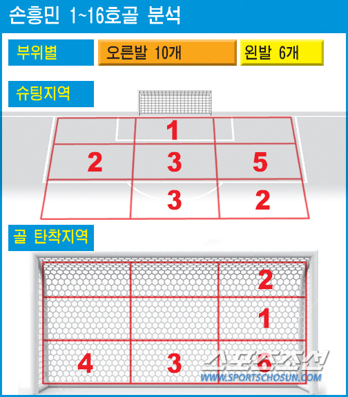 주무기는 역시 오른발이었다. 16개의 골 가운데 10개를 오른발로 만들었다. 왼발로는 6골을 뽑았다. 손흥민은 양발잡이다. 다만 원래부터 오른발을 주로 사용했다. 왼발은 훈련을 통해 슈팅력을 길렀다. 때문에 오른발 슈팅의 파괴력이 더 크다. 골의 탄착 지점은 양쪽 측면 구석이 많았다. 오른쪽 하단으로 6개, 왼쪽 하단으로 4개의 골이 들어갔다. 골키퍼가 잡기 힘든 지점으로 의도적으로 날린 슈팅이었다. 헤딩골은 하나도 없다. 올 시즌 손흥민이 레버쿠젠의 세트피스 전담 키커로 나서고 있기 때문이다. 헤딩슛을 할 기회가 많지 않다. 종합하면 '오른쪽 지역에서 상대 골문 왼쪽 하단을 향해 오른발로 날린 예리한 슈팅'이 손흥민 골의 대표 방정식이다. 실제로 16골 가운데 2골이 이 공식을 따랐다.