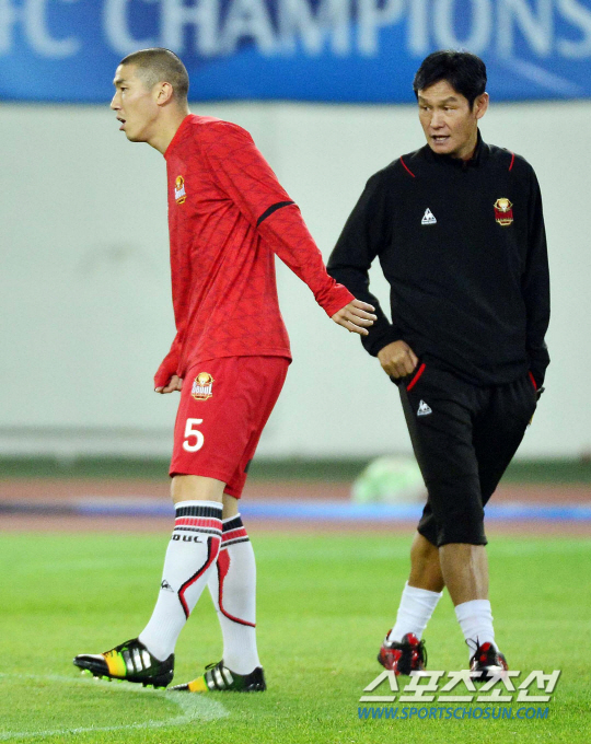 FC서울 최용수 감독이 24일(현지시간) 중국 광저우 텐허 스타디움에서 2015 아시아축구연맹(AFC) 챔피언스리그 H조 광저우 에버그란데 타오바오 경기를 앞두고 훈련 중 차두리와 이야기를 나누고 있다. 2015.02.24. / 광저우(중국) 사진공동취재단