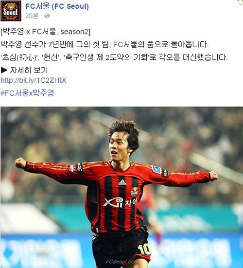 뿐만 아니라 마케팅 적으로도 그가 가진 파급 효과는 무궁무진하다는 판단이다. 지난 2005년 입단 당시에도'박주영 신드롬'을 일으키며 가는 곳마다 구름 관중을 불러 모았던 것처럼, 다시 한번 대형 스트라이커의 천재적인 활약으로 FC서울은 물론 침체된 K리그 부활을 이끌기를 기대하고 있다.