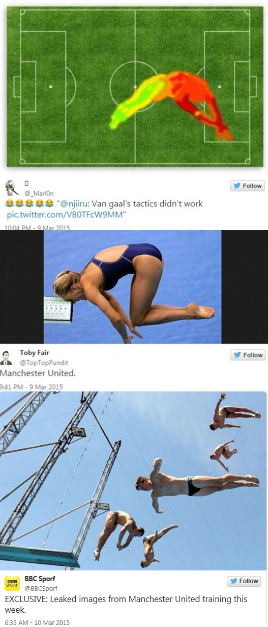 경기 직후 '다이빙'에 대한 팬들의 비난이 빗발쳤다. 경기 직후 팬들은 트위터 등 SNS를 통해 '다이빙' 패러디물을 앞다퉈 올렸다. 블록버스터 '다이하드'의 포스터를 패러디한 '다이브 하드' 포스터에 주연배우 디마리아와 야누자이의 사진을 합성했다. 양팀 선수들의 90분 활동량을 표시하는 히트맵을 페널티박스 안으로 다이빙하는 모양으로 그려올리는가 하면, 다이빙 훈련 사진을 잇달아 올리며 선수들의 할리우드 액션을 조롱했다. 한 네티즌은 다이빙 선수 사진 아래 '판할의 전술이 먹혀들지 않았다'라고 썼다. '특종: 이번주 맨유 훈련 사진 유출'이라는 제하에는 단체 다이빙 훈련 장면을 찍어올렸다. 아스널전 패배의 아픔을 특유의 유머와 톡 쏘는 패러디로 달랬다. 전영지 기자 sky4us@sportschosun.com