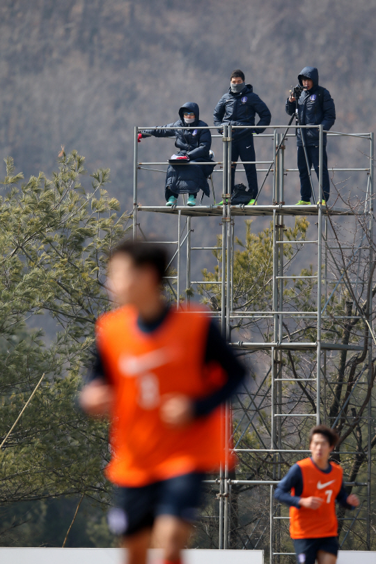 | 신태용 올림픽대표팀 감독(왼쪽)이 11일 열린 자체 청백전을 높은 곳에서 지켜보고 있다. 사진제공=대한축구협회 |