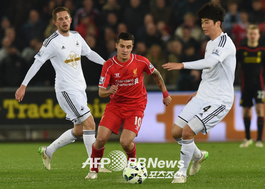 17일 영국 스완지 리버티스타디움에서 열린 리버풀전에서 수비에 가담하고 있는 기성용. ⓒAFPBBNews = News1