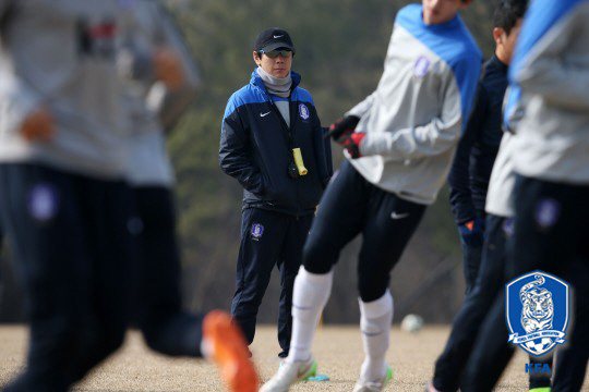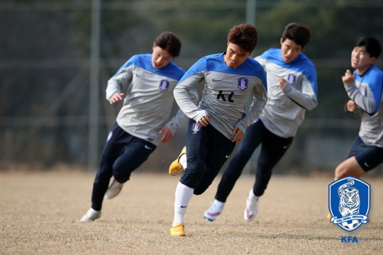 그러나 훈련장의 웃음기는 훈련이 시작되자 순식간에 사라졌다. 선수들의 여유는 굵은 땀방울로, 미소는 거친 숨소리로 바뀌었다. 신 감독의 '극한 체력 훈련' 때문이다. 4인 1조로 한 팀을 이뤄 '원 터치 패스' 훈련을 하다 신호 소리에 맞춰 그라운드를 갈지자(之)로 전력질주하는 훈련이었다. 양쪽 골대 사이에 놓인 폴대를 통과해 18초 안에 그라운드를 가로 질러야 했다. 18초간 전력 질주 후, 18초간 볼 트래핑을 하고 다시 뛰는 훈련이 20분 이상 이어지자 선수들의 얼굴도 굳어졌다. 문창진(포항)은 "아~죽겠다 토할 것 같다"며 이를 악물었고 이광혁(포항)은 훈련 중 쥐가 나 쓰러졌다. 대부분 선수들의 유니폼이 땀으로 흠뻑 젖었다. 신 감독이 첫날부터 훈련 강도를 높인 이유가 있었다. "대부분 소속팀에서 경기를 많이 뛰지 못하니깐 체력이 좋지 않을 것이다. 대회를 앞두고 체력을 빨리 끌어 올려야 한다. 극한의 상황에서도 볼터치를 정확하게 하기 위해 이런 훈련을 한다." 훈련은 90분을 넘어 150분간 진행됐다. 대회 준비기간이 짧아 체력과 전술 훈련을 동시에 소화하겠다는 전략이다. 재미있는 감독님에서 호랑이 선생님으로 변신한 신 감독의 극한 훈련에 선수들은 뒤통수를 맞은 듯, 할 말을 잃었다. "말을 많이 해!" 신 감독의 외침에 비로소 '화이팅~' 소리가 흘러나왔다.
