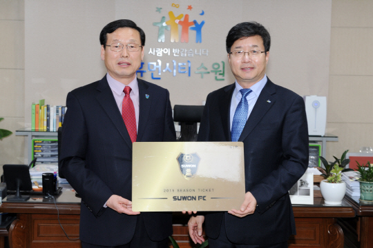 수원FC 구단주인 염태영 수원시장이 2015년 수원FC 연간회원권을 구입하며 K리그 클래식 승격 기원에 힘을 보탰다.