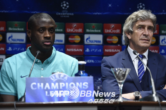 Manchester City's Ivorian midfielder Yaya Tourei (L) speaks gives a press conference with Manchester City's Chilean coach Manuel Pellegrini in Barcelona on March 17, 2015, on the eve of the UEFA Champions League round of 16 second leg football match between FC Barcelona and Manchester City. AFP PHOTO / JOSEP LAGO