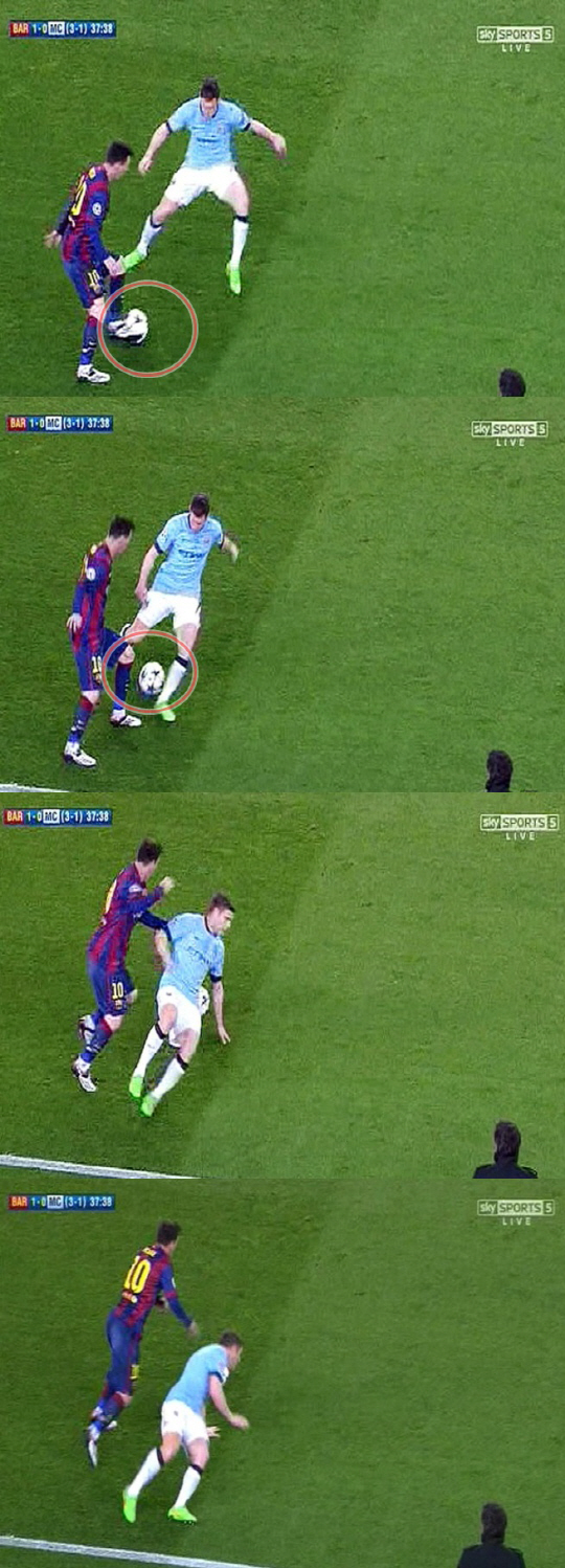이날 전반 37분 메시는 오른쪽 측면에서 밀너의 가랑이 사이로 공을 완벽하게 빼냈다. 전광석화같은 움직임, 완벽한 기술이었다. 맨시티 수비 에이스 밀너를 꼼짝없이 돌려세웠다. 이경기 2번째 '넛메그'였다. 이미 한차례 페르난디뉴에게 굴욕을 선사한 후였다.