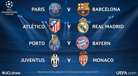 이날 챔피언스리그 8강은 마드리드 더비 외에 파리생제르맹(PSG)-바르셀로나, 포르투-바이에른 뮌헨, 유벤투스-AS 모나코의 매치업으로 결정됐다.
