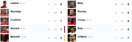 양팀 합계 최고 평점은 2골을 넣으며 맨유의 승리를 이끈 마타가 차지했다. 마타는 스카이스포츠로부터 평점 9점을 받았다.