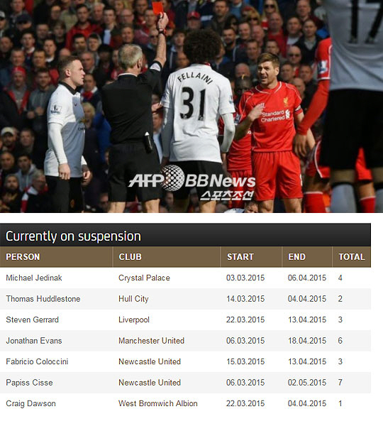 잉글랜드축구협회(FA)는 24일(한국 시각) 제라드가 EPL 31라운드 아스널 전(4/4), FA컵 8강 재경기 블랙번 전(4/8), EPL 32라운드 뉴캐슬 전(4/13)에 출전할 수 없다고 밝혔다.
