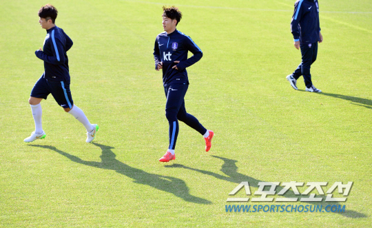 전날 주말 경기를 뛴 선수들을 위해 가벼운 러닝과 족구 등 회복훈련을 한 선수단은 25일 대전월드컵경기장으로 이동해 본격적인 훈련을 진행했다. 슈틸리케 감독이 강조한 것은 측면이었다. 측면 쪽에 두개의 폴대를 설치한 후 공이 통과할 경우 점수를 주는 방식의 훈련이 진행됐다. 윙어들의 중앙 미드필더와 연계, 윙백들의 활발한 오버래핑 등을 점검했다. 조끼팀은 정동호-손흥민, 박주호-이재성이 짝을 이뤄 남태희와 함께 측면을 공략했고, 비조끼팀은 윤석영-김보경, 한교원-구자철이 사이드를 노렸다. 기성용은 어느 팀에도 속하지 않고 연계의 중심에 섰다.