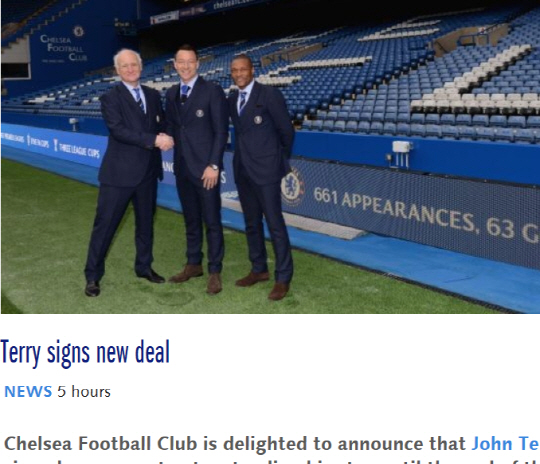 첼시는 27일(한국시각) 구단 홈페이지를 통해 테리와의 재계약을 발표했다. 테리는 2015~2016시즌까지 첼시 소속이다. 1998년 첼시 유니폼을 입은 그는 무려 18시즌 동안 첼시에서 뛰게 됐다. 첼시는 "테리와 새로운 계약을 하게 된 것을 기쁘다"고 발표했다.
