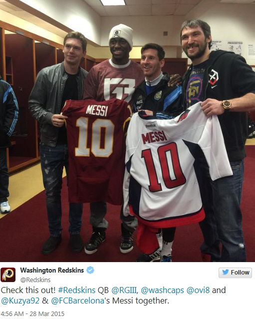 메시는 이번 미국 투어를 즐기고 있는 모습이다. 워싱턴 연고의 타종목 선수들과는 이미 유니폼을 여러장 교환했다. 25일 미국프로농구(NBA) 워싱턴 위저즈와 인디아나 파서스 경기를 관전한 후 유니폼을 받았고, 27일 미극 프로풋볼(NFL) 워싱턴 레드스킨스를 방문한 자리에선 쿼터백 로버트 그리핀 3세 등으로부터 메시의 이름이 마킹된 10번 유니폼을 선물로 받았다. 전영지 기자 sky4us@sportschosun.com