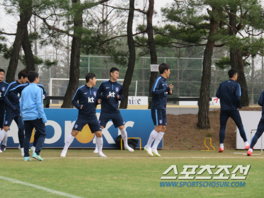 지동원은 언제나처럼 담담하고 당당했다. 슈틸리케 A대표팀 감독이 이례적으로 뉴질랜드전 선발 기용을 예고한 후다. 우즈벡전(1대1 무) 이튿날인 28일 오후 슈틸리케호는 두 팀으로 나뉘어 훈련했다. 전날 90분 풀타임을 소화한 선수들은 회복훈련조에서 가볍게 몸을 풀고 볼뺏기 게임, 골대 맞추기 게임 등을 즐겼다. 지동원과 이날 새로이 합류한 김은선(수원), 전날 경기에 나서지 않거나 교체출전한 박주호 한교원 남태희 김주영 김영권 등은 전술 훈련과, 3대3 미니게임에 참여했다. 전날 이마가 1.2㎝ 정도 찢어진 원톱 이정협은 병원을 다녀왔다. 굳이 무리하지 않았다. 간단한 전술 훈련과 스트레칭, 러닝 등을 소화했다.