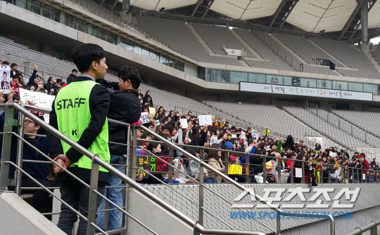 '콘서트장' 같은 열기가 아침 적막을 깼다. 훈련 시작 2시간 전부터 경기장 출입구에 긴 줄이 늘어섰다. 제각각 선수들의 이름과 응원 메시지를 담은 플래카드를 손에 들고 문이 열리기 만을 기다렸다. 대한축구협회 관계자는 "지난 대전 훈련 당시엔 400여명이 왔는데, 오늘은 1000명이 넘었다. 역시 서울이 다르긴 다르다"고 웃음을 지었다. 대전에서의 규모를 예상했던 안전요원들이 몰려드는 팬들의 동선을 관리하느라 진땀을 흘리는 장면도 곳곳에서 보였다.