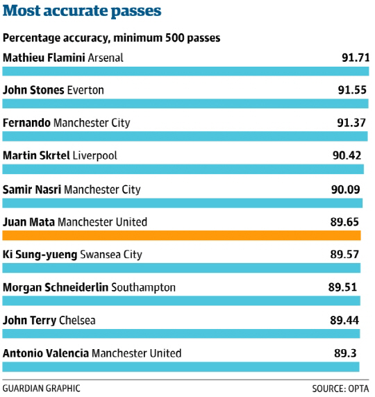 6위부터 10위까지는 후안 마타(맨유), 기성용, 모건 슈나이덜린(사우샘프턴), 존 테리(첼시), 안토니오 발렌시아(맨유)가 차례대로 랭크됐다. 기성용의 가치는 주로 압도적인 활동량과 그러면서도 매경기 풀타임을 소화하는 뛰어난 체력에 방점이 찍혀있지만, 내노라 하는 선수들에게도 뒤지지 않는 패스성공률도 일품이다.