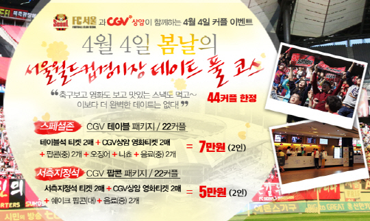 FC서울과 CGV상암이 준비한 봄날 데이트 패키지는 'CGV 팝콘 패키지' 22커플, 'CGV 테이블 패키지' 22커플 등 총 44커플만 선착순으로 예매 가능하며, FC서울 홈페이지에서 서측지정석과 스페셜존 테이블석 중 원하는 좌석 2자리를 선택 후 'CGV 패키지'를 선택하면 패키지 상품을 이용할 수 있다. 단, 경기 전날인 4월 3일 오후 6시 이후에는 취소가 불가하다.