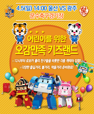 울산은 5일 울산월드컵경기장에서 광주와 2015년 현대오일뱅크 K리그 4라운드를 치른다. 이날 경기서 울산 구단은 봄맞이 나들이에 나서는 가족들을 겨냥한 다양한 즐길거리와 볼거리를 마련해 팬심을 유혹하고 있다. 이날 경기장 주변에선 어린이들 사이에 선풍적 인기를 끌고 있는 '로보카 폴리' 주인공들을 만나볼 수 있다. 또 울산지방경찰청이 지원하는 포돌이, 포순이 등 총 10종 이상의 캐릭터들이 어린이 팬들을 맞을 준비를 하고 있다. 이들은 경기 전 그라운드에 도열해 90분 승부에 나서는 선수들도 격려할 예정이다.