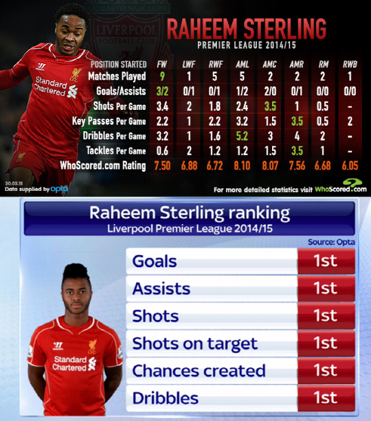 현재 리버풀이 책정한 스털링의 몸값은 5000만 파운드(약 813억)다. 유력한 구매자는 아스널과 맨체스터시티(맨시티)인 것으로 알려렸다, 앞서 맨시티의 마누엘 페예그리니 감독은 스털링을 가리켜 '1억 파운드의 가치가 있는 선수'라며 칭찬한 바 있다. 올시즌 기록은 36경기 7골 8도움이다.