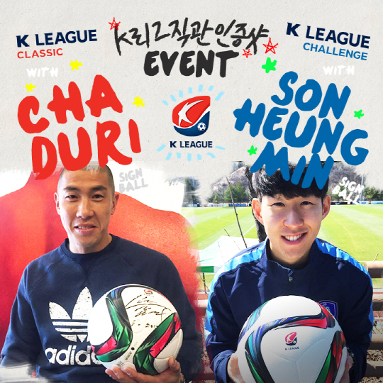 두 선수의 사인볼 증정 이벤트는 4~5일 경기장을 찾는 축구 팬 누구나 참여가 가능하다. K리그 공식 SNS(페이스북 www.facebook.com/withKLEAGUE, 트위터 twitter.com/kleague, 인스타그램 @kleague)에 직관 인증샷과 함께 댓글이나 메시지를 남기는 방식으로 응모할 수 있다. 차두리, 손흥민 선수의 사인볼은 클래식과 챌린지를 직관한 인증샷을 남긴 팬들을 대상으로 추첨을 통해 증정한다.