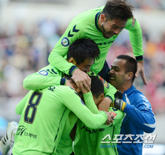FC서울과 전북현대의 2015 K리그 클래식 경기가 14일 서울월드컵경기장에서 열렸다. 후반 전북 에닝요가 추가골을 터뜨린 후 선제골을 터뜨렸던 에두, 이동국과 함께 기쁨을 나누고 있다. 상암=허상욱 기자 wook@sportschosun.com/2015.03.14/