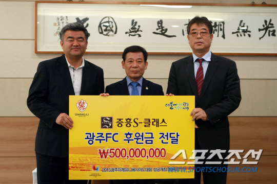 광주는 8일 광주광역시청에서 윤장현 광주광역시장(광주 구단주), 정원주 중흥건설 사장(광주 대표이사), 기영옥 광주 단장 등이 참석한 가운데 5억원 후원금 전달식을 가졌다.