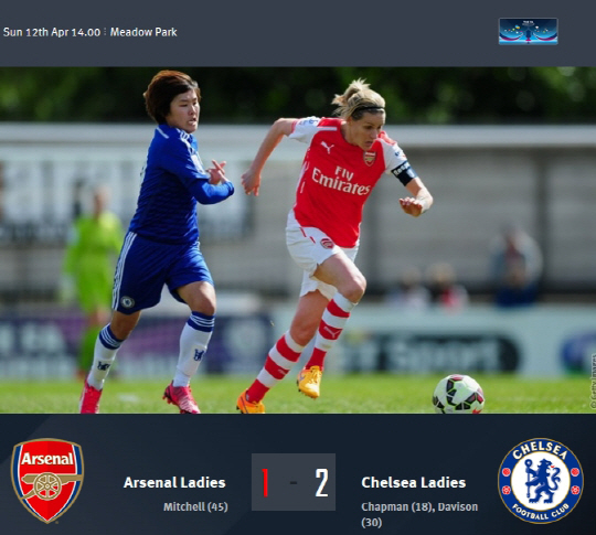 지소연은 12일 밤 10시(한국시각) 영국 허드포드셔 보어햄우드 메도우파크에서 진행된 영국 여자축구 FA컵 '디펜딩 챔피언' 아스널과의 8강전에서 전반 17분 특유의 날선 코너킥으로 '캡틴' 케이티 채프먼의 헤딩 선제골을 이끌었다. 첼시 레이디스는 전반 젬마 데이비슨이 추가골을 터뜨리며 2대1로 승리했다.