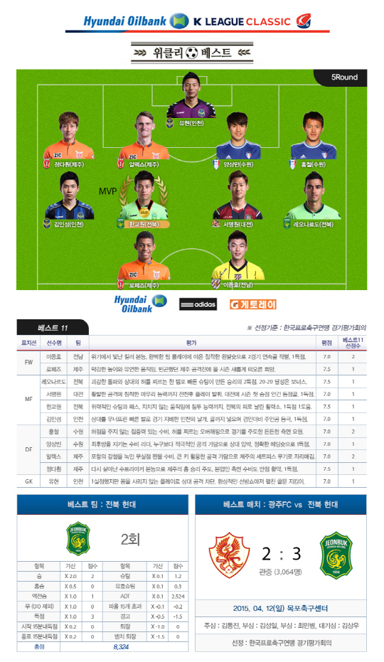 5라운드 베스트매치는 5골이 터진 전북-대전전이 선정됐다. 전북이 3대2로 승리했다.