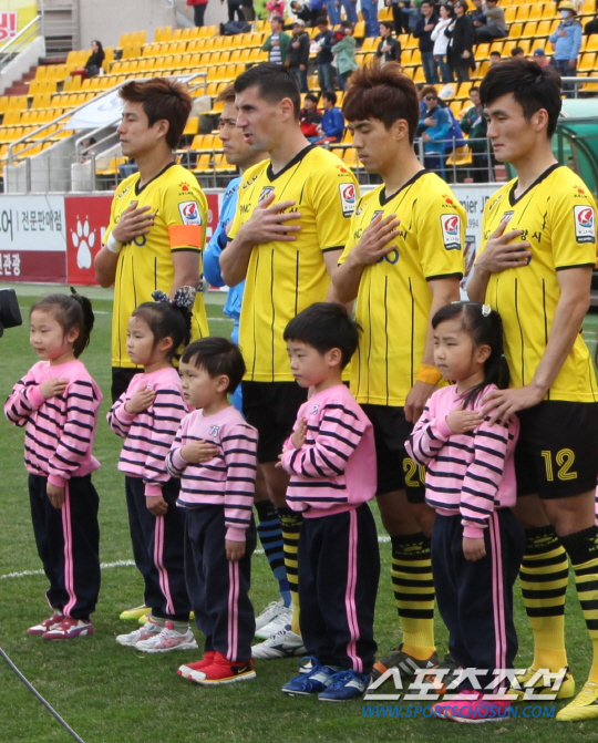 ◇'전남의 정신적 지주' 스테보는 매경기전 국민의례 때면 어김없이 가슴에 경건하게 손을 얹는다. 에스코트 어린이들의 손 매무새도 바로잡아 준다. 천생 '한국사람'이다. "제2의 조국, 한국에 대한 존경심을 표현하는 것은 당연하다"고 했다. 사진제공=전남드래곤즈 구단