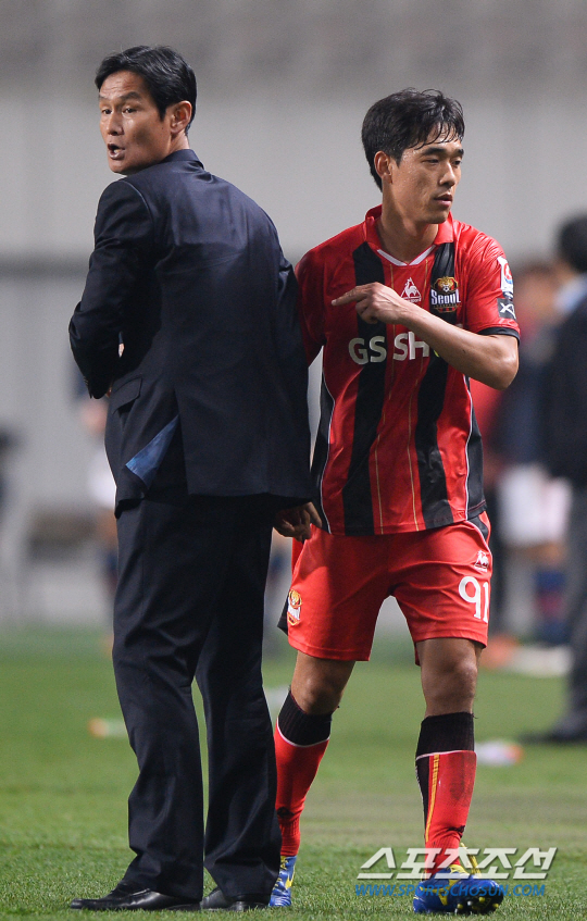 FC서울이 15일 오후 상암동 서울월드컵경기장에서 K리그 클래식 6라운드 대전 시티즌과 경기를 펼쳤다. 1승 1무 3패로 10위를 기록 중인 FC서울과 개막 후 5경기서 1무 4패로 최하위인 대전의 맞대결이다. FC서울 박주영이 후반 교체되어 나오며 최용수 감독과 포옹을 나누고 있다. 상암=송정헌 기자 songs@sportschosun.com/2015.04.15